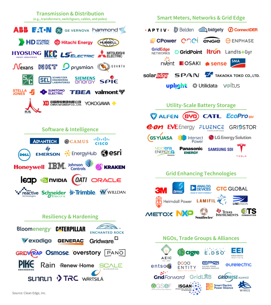 With the continued expansion of renewable energy, the electrification of transportation and heat, and the rapid growth of data centers to support AI, global demand for electricity is surging. Electricity grids require significant investment to meet this skyrocketing demand. According to Bloomberg New Energy Finance, grid spending is expected to reach $577 billion annually by 2027, up from an estimated $479 billion in 2025. Clean Edge’s 2026 Grid Market Map represents a selection of companies and organizations contributing to the grid across a range of sectors, from transmission & distribution manufacturers and data and software providers to grid enhancing technology innovators and energy storage players. This year we made a number of changes to the market map, including reclassifying players such as Eaton and GE Vernova; removing companies that went bankrupt or changed their business focus, including Sunnova and NGK Insulators; adding companies such as Bloom Energy and KEC International; and bolstering our NGO and trade group section, in particular by adding in European players such as the EU DSO and Eurelectric. As always, this is not an exhaustive list but a high-level survey of established and emerging players.