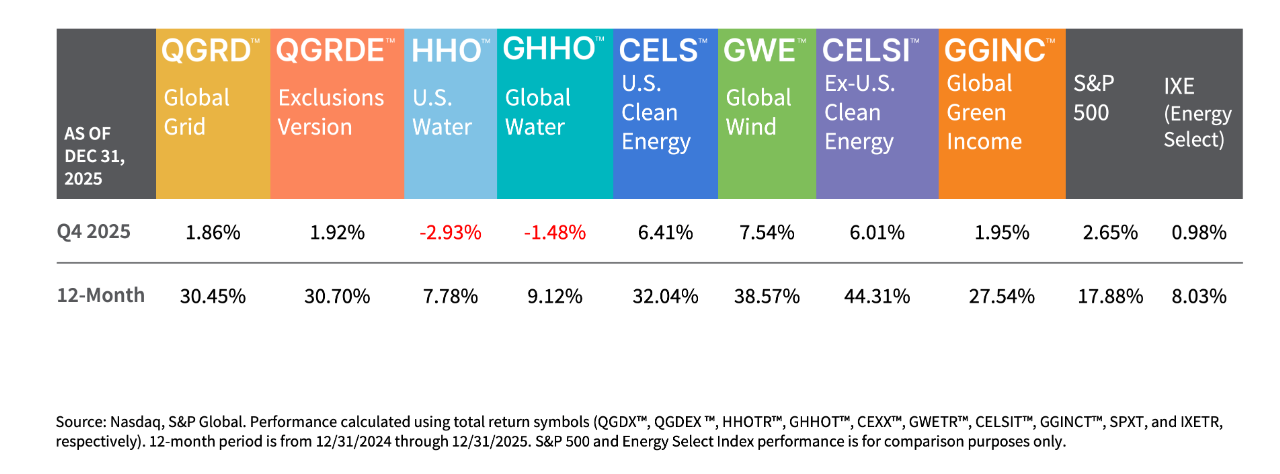On a total return basis, during Q4 2025, the ISE Clean Edge Global Wind Energy™ Index (GWE™), Nasdaq Clean Edge Green Energy™ Index (CELS™), and Clean Edge International Green Energy™ Index (CELSI™) were the top performers, up 7.54%, 6.41%, and 6.01% respectively. During the quarter, the Nasdaq Clean Edge Global Green Income™ Index (GGINC™) was up 1.95% and grid-focused Nasdaq OMX Clean Edge Smart Grid Infrastructure™ Index (QGRD™) and the exclusions-version (QGRDE™) were up 1.86% and 1.92% respectively. The ISE Clean Edge Water™ Index (HHO™) and the Nasdaq Clean Edge Global Water™ Index (GHHO™) declined 2.93% and 1.48% respectively.