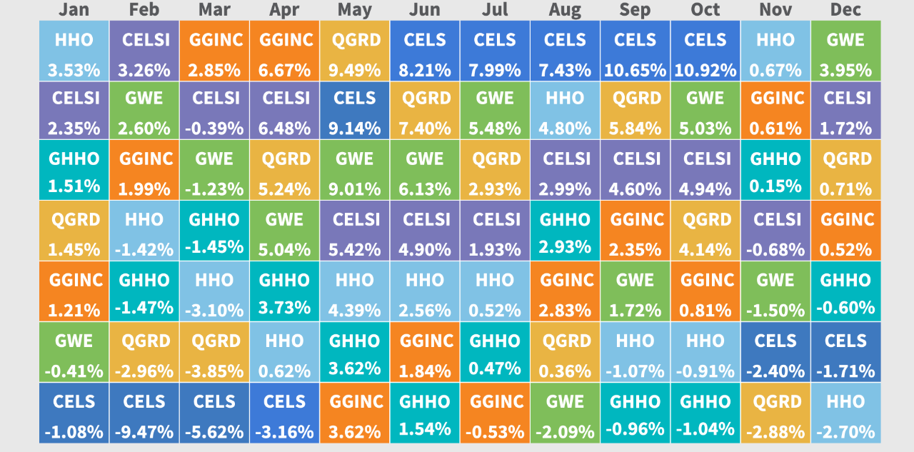 Over the past 12 months, U.S.-focused clean-energy index CELS™ experienced the greatest volatility, landing in the top spot five times and in the bottom spot four times (notably at the beginning of 2025). Ex-U.S. clean energy (CELSI™) placed in or near the top eight of 12 months, with clean energy, including wind, dominating the top spots. Recent high-performer QGRD™ (global smart grid and grid infrastructure) placed in both the top and bottom spot once, with other placements dispersed widely across the leader board.