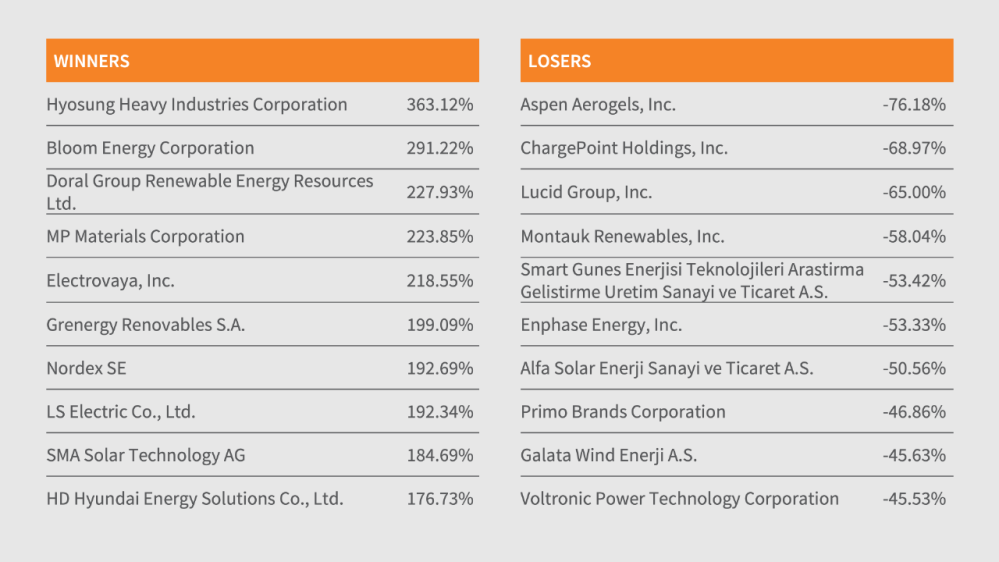 Below is a list of the top 10 best and worst constituent performers (ranked by price return in USD) across all Nasdaq Clean Edge Nasdaq indexes during 2025. Top 10 performers reflected a broad diversity of sectors, spanning grid, energy storage, fuel cells, rare earths, solar, and wind.